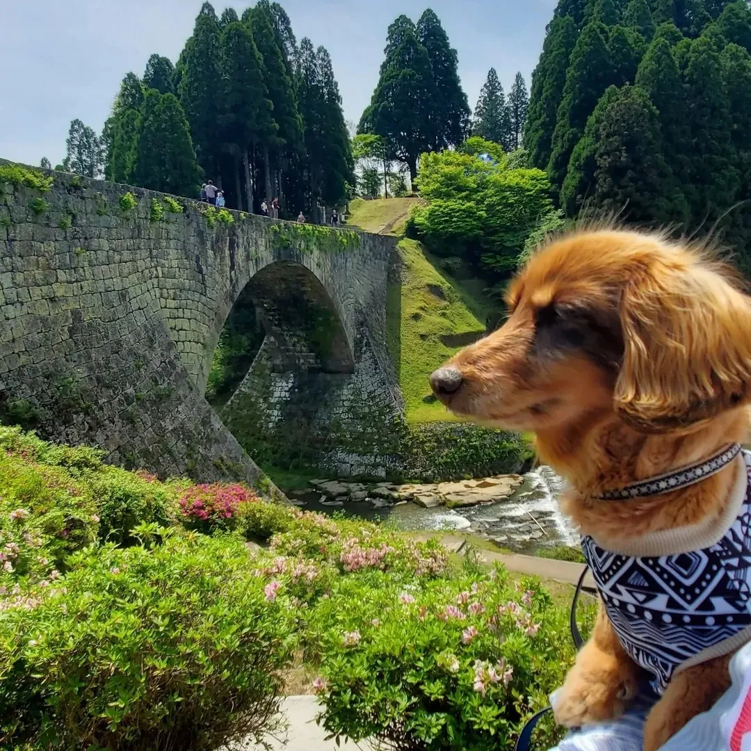 最初の目的地は通潤橋! 放水時間にはタイミングが合いませんでしたが、橋上見学を含めて周辺を散策🐾 吹く風が心地よく、虎太朗ペースでのんびりゆっくり回りました🎵